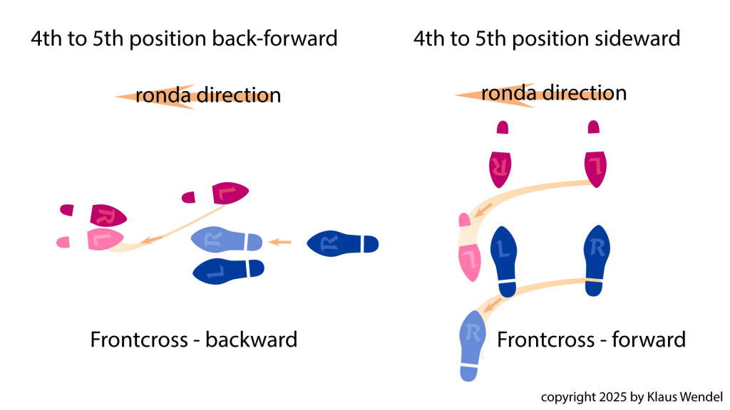 Das Einkreuzen der Folgenden ergibt sich aus einer Rückwärtsbewegung. Es müsste in geschlossener Umarmung entstanden sein, weil die Partnerin dann das Becken zu einem Vorwärtskreuz nicht gut drehen kann. Denn ursprünglich war es ein vorwärts gerichteter Kreuzschritt, (siehe Diagramm rechts) der jedoch später rückwärts eindreht (siehe Diagramm links) getanzt wurde.